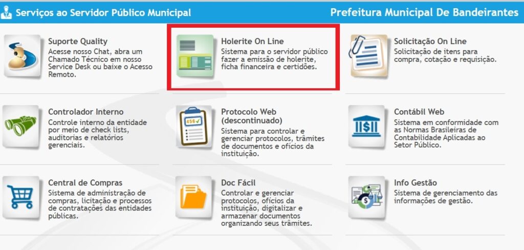O documento deve ser acessado no site da prefeitura: https://bandeirantes.ms.gov.br/v2/ , clicando no menu “Holerite Online”, no final da página.